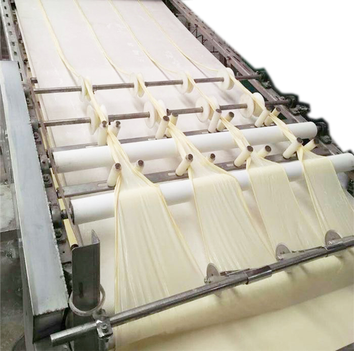 豆?jié){放入蒸發(fā)鍋后,經保溫吹涼過程,將鍋表面結皮的產品送入輸送帶,自動卷起、烘干一體機,如此反復,至將