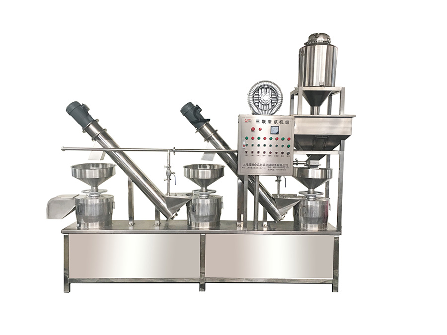 該設備具有自動制漿、混合、分離、輸漿功能一次性完成,在生產過程中,精確的控制水、豆、漿水濃度,一遍漿和二遍漿做為生產用漿,三遍漿水供磨豆和一遍攪渣使用,二遍攪渣使用清水,輕松磨制高濃度漿,提取率高達98%。本機組可連續不間斷出漿,無需其他調節,為企業節約人力資源,提高了產品的穩定性。設備低耗能、循環自清洗,實用性高,適合中小型加工廠使用。